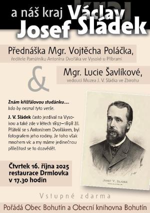 Ve čtvrtek 16. 10. 2025 se od 17:30 uskuteční přednáška Mgr. Vojtěcha Poláčka a Mgr. Lucie Šavlíkové o J. V. Sládkovi. Místem konání je restaurace Drmlovka.
