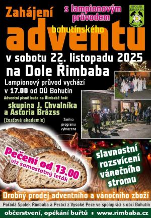 V sobotu 22. 11. 2025 ožije okolí OÚ Bohutín dětmi s lampiony, které povedou andílci a zavedou je na odval dolu Řimbaba, kde bude rozsvícen vánoční stromek, opečou se buřty, požije se lahodný teplý mok a ochutná se něco dobrého ze pece. Akce začíná v 17:00 hod. u OÚ Bohutín.