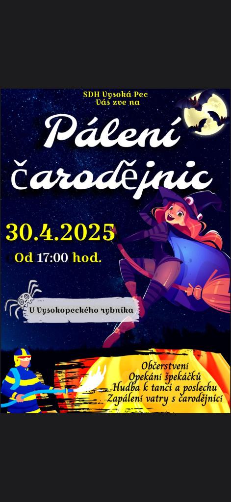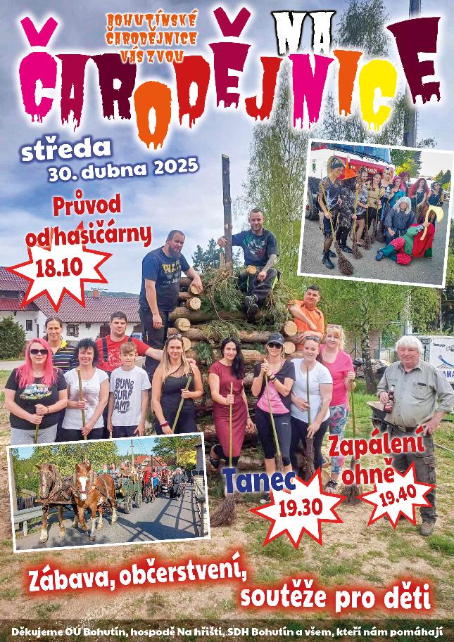 Ve středu 30. 4. 2025 se budou pálit čarodějnice na 3 místech: Bohutín v areálu SK Litavanu Bohutín, na Řimbabě a u Vysokopeckého rybníka. Přijďte pocítit vůni ohně, zkouknout tanec, zasoutěžit a upéct buřtíka, ochutnat chléb, či od vatry pohledět na Vysokopecký rybník...