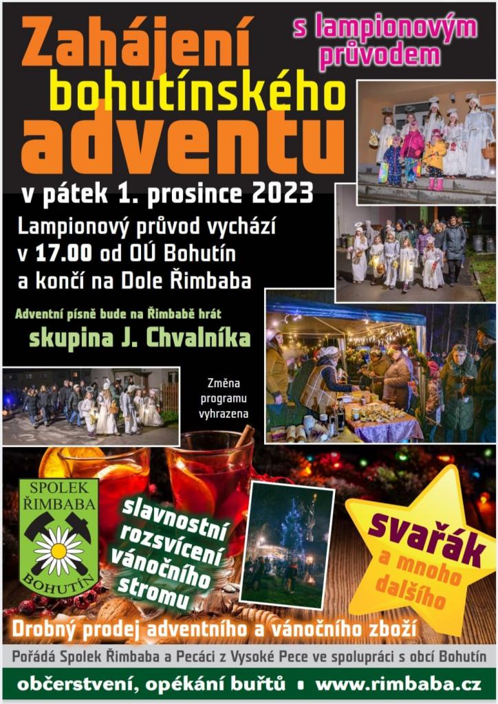 Přijďte se 1. 12. 2023 od 17:00 hod. projít lampionovým průvodem od OÚ Bohutín na Řimbabu a zakončit tak zahájení adventu teplým mokem a opéct si buřtíky s dětmi.