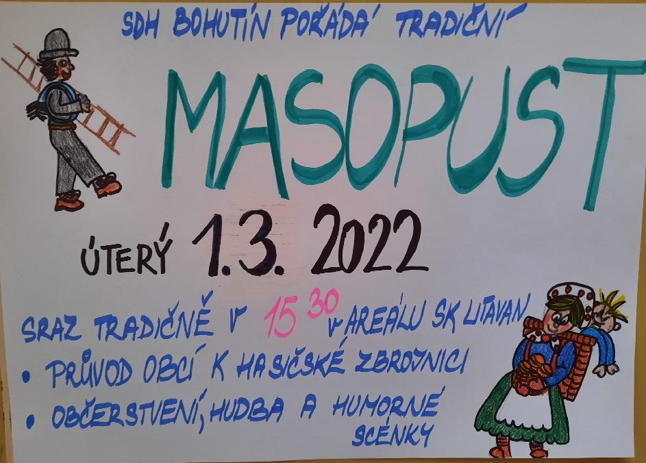 Dne 1. 3. 2022 se uskuteční tradiční "Bohutínský masopust". Průvod obcí vyjde v 15:30 z areálu SK Litavan Bohutín.