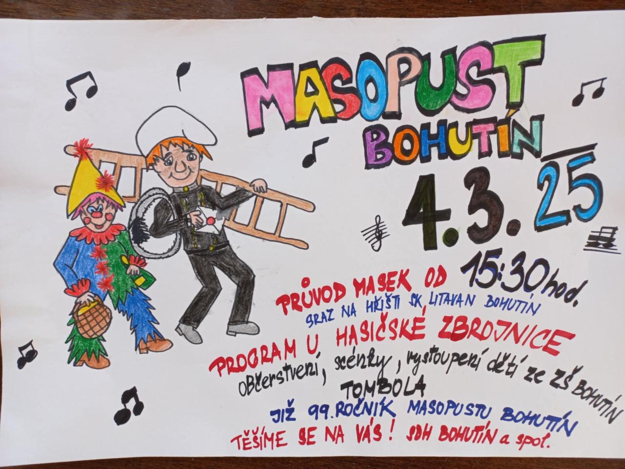 V úterý 4. 3. 2025 se bude konat 99. ročník bohutínského masopustu. Přijďte se projít průvodem, který vyjde ve 15:30 z areálu SK Litavan Bohutín, a zažijte tu pravou masopustní atmosféru. Veselé scénky proběhnou u hasičárny. Zde si bude moci dát lahodný mok, něco dobrého zakousnout a zatančit si.