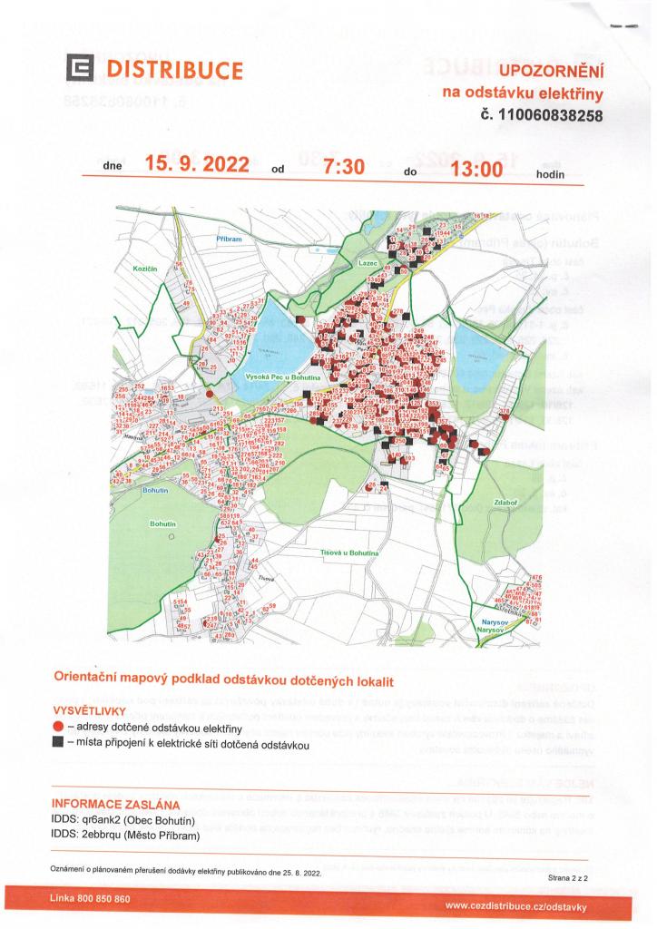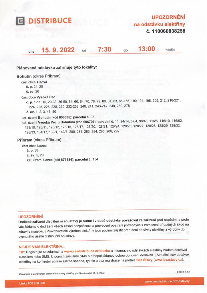 Dne 15. 9. 2022 bude odstavena elektřina od 7:30 do 13:00. Všechna čísla popisná, čísla evidenční, katastrální území a parcelní čísla, jichž se odstávka elektřiny bude týkat, jsou v příloze této zprávy, zároveň je přílohou i mapa.