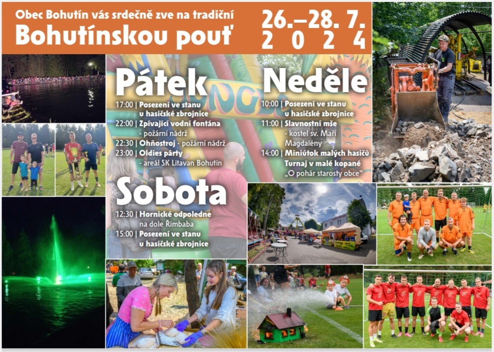 Od pátku 26. 7. do neděle 28. 7. proběhnou v Bohutíně tradiční pouťové oslavy. Na plakátu naleznete, co se kde bude konat. Navíc nás na Řimbabě čeká povídání paní PhDr. Věry Smolové. A samozřejmě pouťové atrakce na návsi. Tak přijďte.