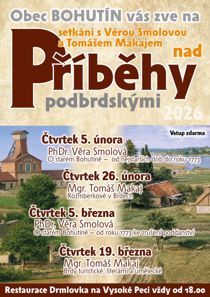 Od čtvrtka 5. 2. 2026 budou v restauraci Drmlovka probíhat povídání (semináře) paní Věry Smolové a pana Tomáše Makaje. Jak jste zvyklí z předchozích let, povídání budou v únoru a březnu, celkem čtyřikrát. Přijďte si poslechnout něco z historie a něco z Brd... Všichni jste srdečně zváni.