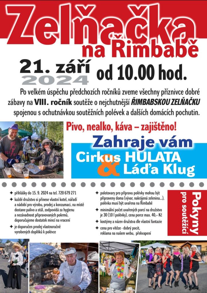 21. 9. od 10:00 hod. budete moci ochutnat nejen zelňačky, ale i jiné dobroty na Řimbabě. Tak nevařte a přijďte! Dobré jídlo, dobrá parta, hudba, posezení...